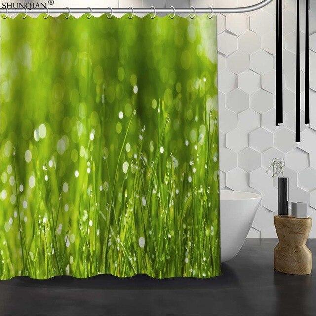 Maak van elke douche een verfrissende ervaring met dit prachtige douchegordijn gras met dauwdruppels.