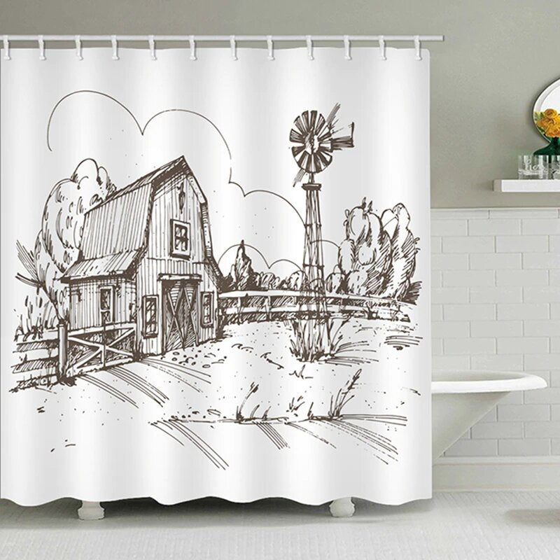 Ervaar elegantie en functionaliteit met onze Douchegordijn met tekening van een boerderij. Ontworpen om je badkamer te verfraaien en een aangename douche-ervaring te bieden, combineert het verfijnd design met dagelijks gebruiksgemak.