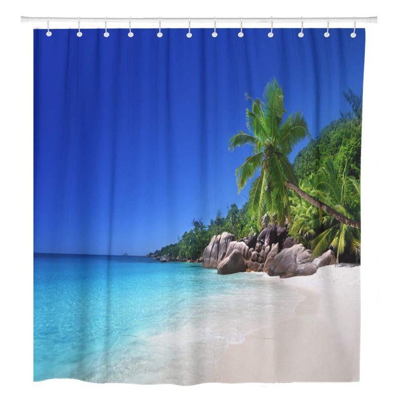 Ervaar elegantie en functionaliteit met onze Douchegordijn met tropisch paradijs strand. Ontworpen om je badkamer te verfraaien en een aangename douche-ervaring te bieden, combineert het verfijnd design met dagelijks gebruiksgemak.