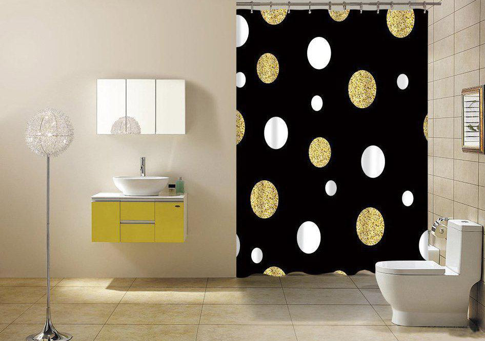 Ervaar elegantie en functionaliteit met onze Zwart douchegordijn met gouden glitterstippen. Ontworpen om je badkamer te verfraaien en een aangename douche-ervaring te bieden, combineert het verfijnd design met dagelijks gebruiksgemak.